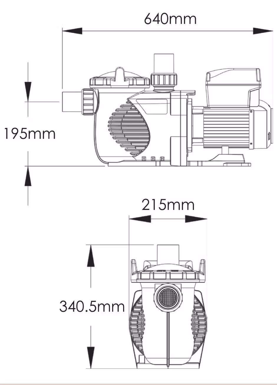 Passar till de flesta storlekar då man anpassar hastigheten efter storlek på pool Elmotor ineffekt max 1,3kW (1,5 HP), RPM: 800-3400. Anslutningar 50 mm inv limmuff på sugsidan och 50 mm limmuff på trycksidan ingår och ansluts till 50 mm slang eller rör. Godkänd för kontinuerlig drift med 0,5 % salt i poolvattnet. Två års garanti.
