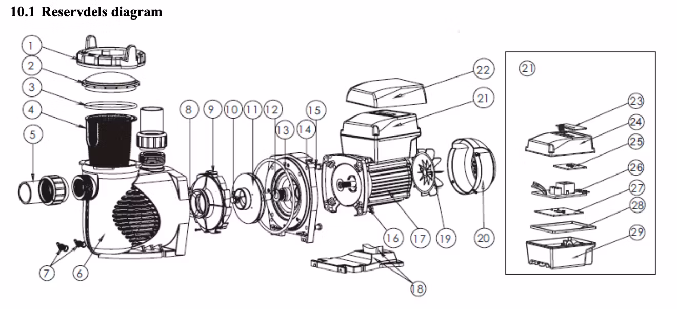 Poolstorlek: 30-100 m³, max flöde 25 m³/h. Passar bra med sandfilter: 480-800 (beroende på storlek på pool).