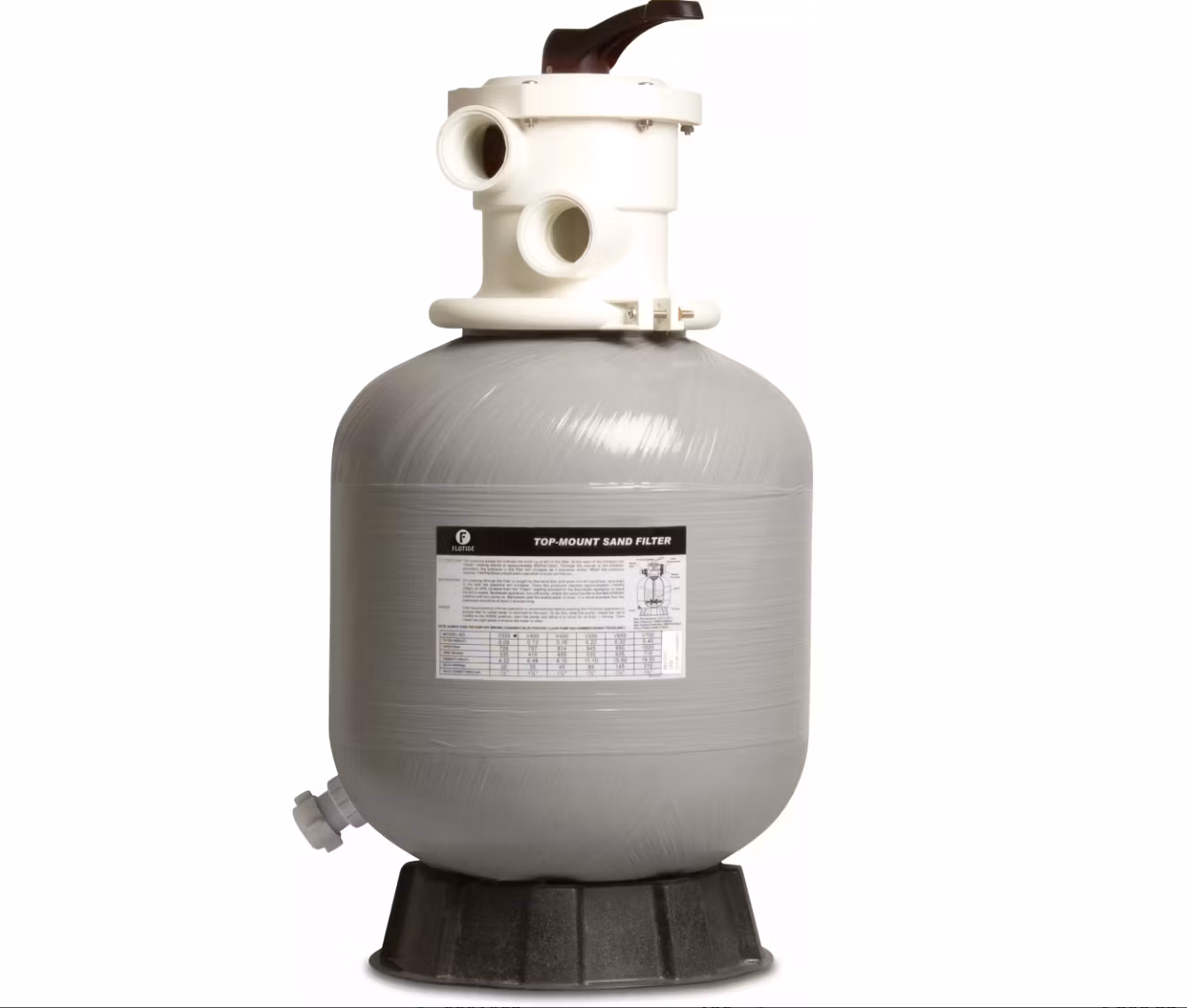 OBS! kontrollera att bottenarmarna är monterade och ordentligt iskruvade innan du fyller på sand. Max poolvolym 20 m³. Tryck 2,5 bar.