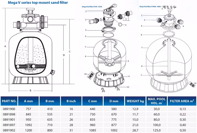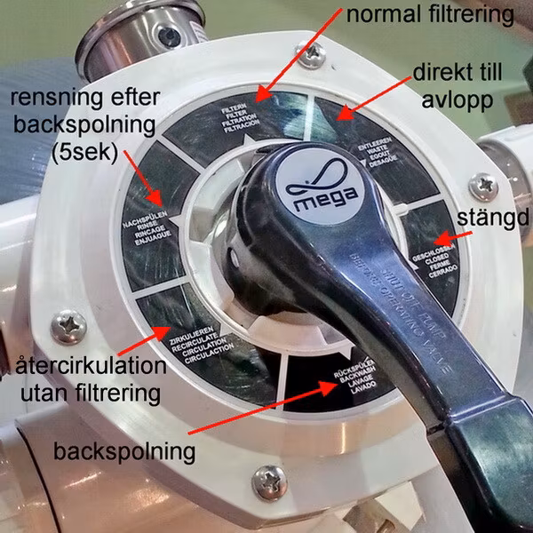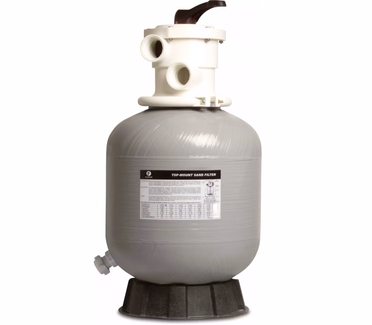 Fd. Mega Nordic 535, har nu bytt namn till Flotide. Ett tåligt poolfilter i glasfiberarmerad plast från Flotide. 50mm limrörsanslutning via union till 1½" gänga medföljer. Fylls med 85kg (3½ säckar) fin filtersand, alternativt 1 grov & 2½ fin. Om du vill använda filterglasmedia, så rekommenderar vi 3x25kg säckar. Diameter 535mm/26" filteryta 0,22 kvm beräknat flöde 12 kbm/h. Manometer ingår. Välj gärna ett stort sandfilter om du har plats. Din poolpump får det lättare och du får en mycket bättre cirkulation i poolen med större flöde. Sen slipper du backspola så ofta också. Filtret fraktas på pall, så passa på att beställa filtersand samtidigt, då fraktkostnaden inte ökar. Anpassat för pumpar mellan 0,75-1,3 kW. OBS! kontrollera att bottenarmarna är monterade och ordentligt iskruvade innan du fyller på sand. Manual finns HÄR