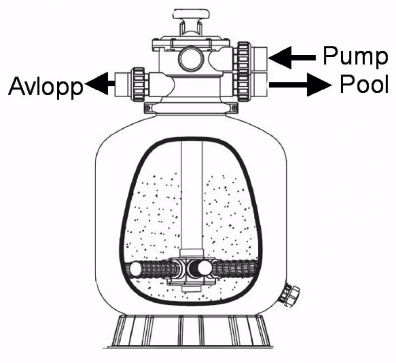 Filtermedia: 85 kg sand (1 grov - 2½ fin), alternativt 75 kg glasmedia (1st grov & 2st fin)